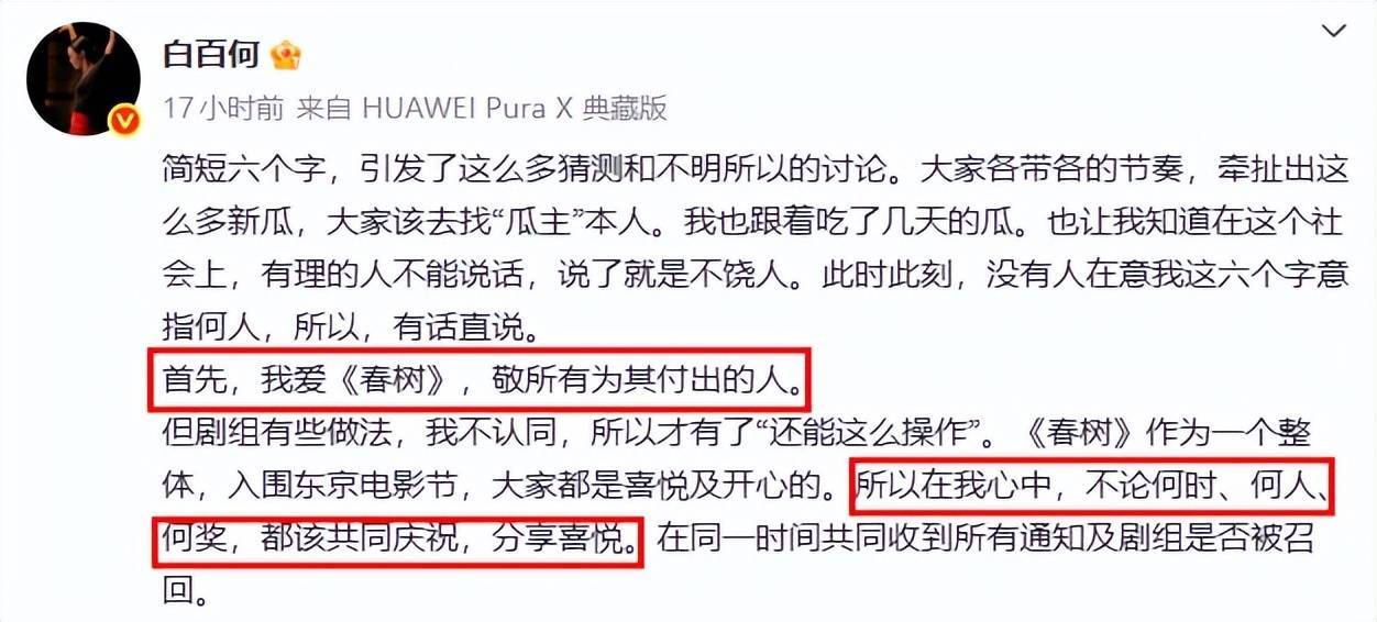 就在王传君领奖前几天,白百合突然在社交平台发布了一则讯息。